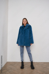 Woman in blue faux fur coat, denim jeans, and black boots stands confidently on wooden floor. Her hands rest at her sides against a plain white wall; she wears a neutral expression