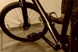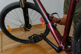 Bike mechanic cleaning and polishing mountain bike frame with cloth, emphasizing maintenance and repair skills in workshop environment, close-up. Concept of bike maintenance and service.