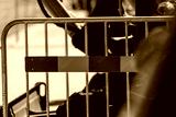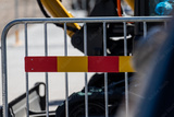 construction barrier with red and yellow reflective warning stripe on metal fence closeup industrial safety zone heavy equipment background outdoor protection sign day time urban work site scene