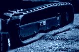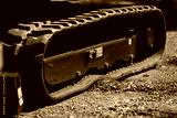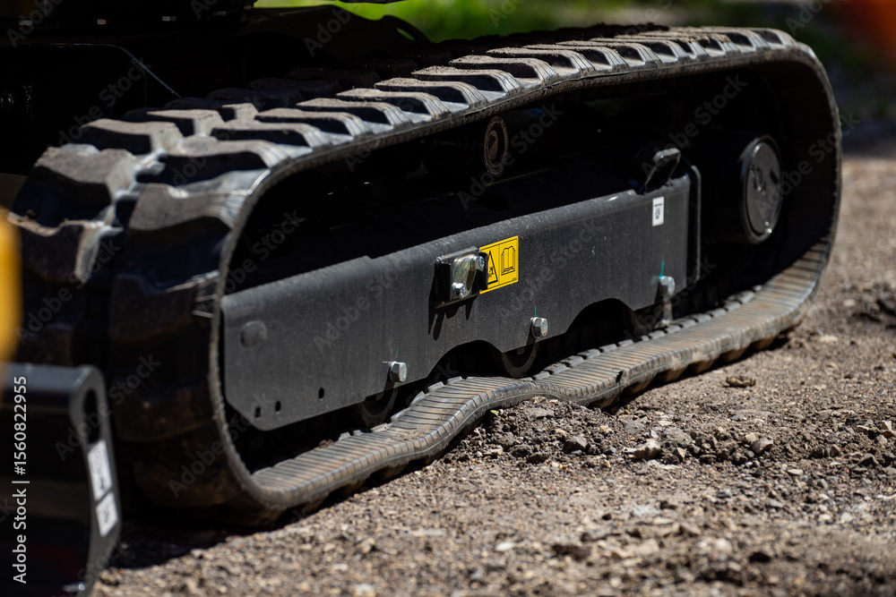close up of rubber track on modern compact excavator heavy construction machinery equipment for digging and earthmoving at job site rugged industrial detail on crawler vehicle track system outdoors