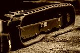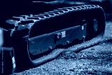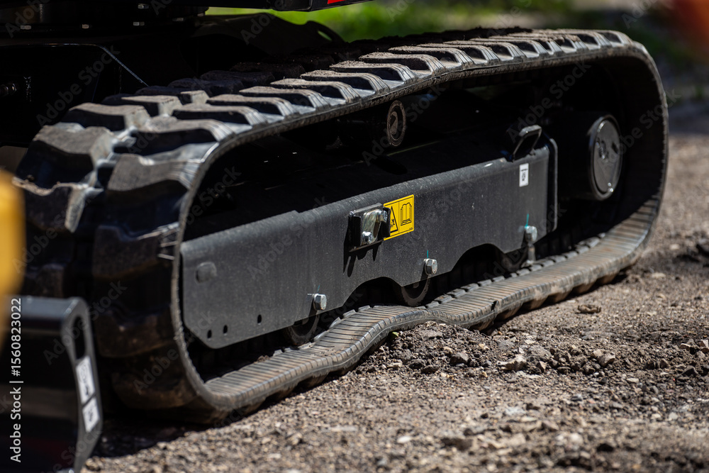 close up of rubber track on modern compact excavator heavy construction machinery equipment for digging and earthmoving at job site rugged industrial detail on crawler vehicle track system outdoors