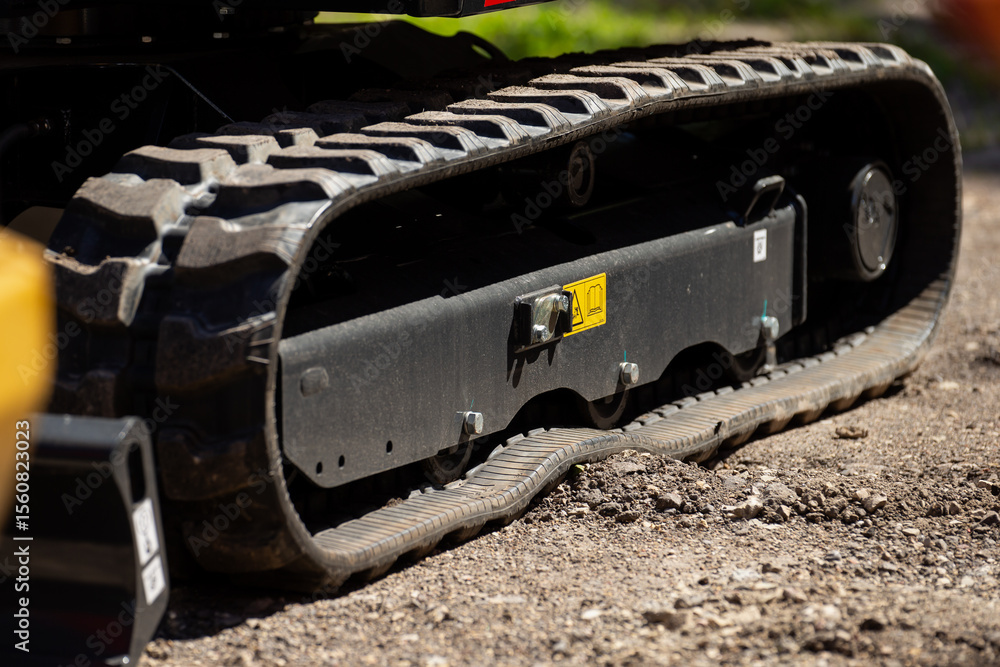 damaged rubber track on compact crawler excavator construction equipment close up worn track system on industrial machinery at work site heavy duty machine maintenance repair required outdoor scene