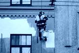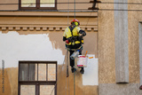 industrial rope access worker painting exterior building wall wearing safety harness and helmet professional facade maintenance high rise painter restoration repair construction jobsite