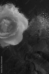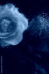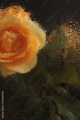 Smoke selected soft focus Yellow Rose Flower bud through glass with wet flow water drops. Abstract natural black blur background.