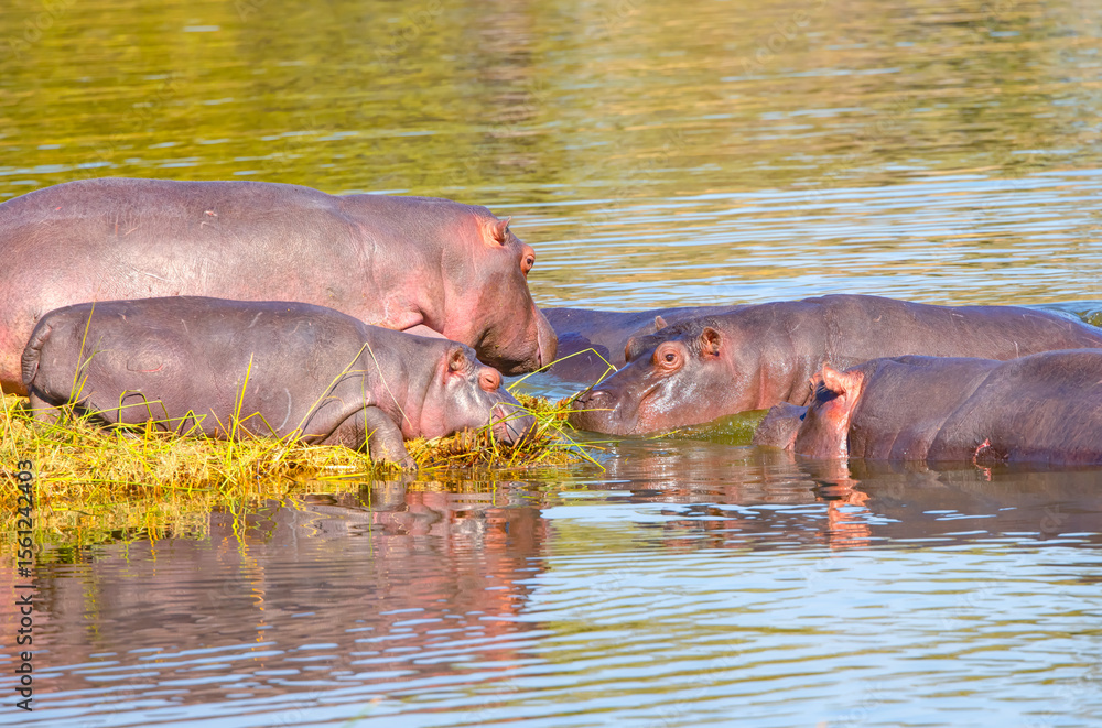 A hippo family resting on a small island - South Africa