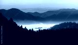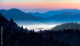 Beautiful landscape with cascade blue mountains at the morning - View of wilderness mountains during foggy weather