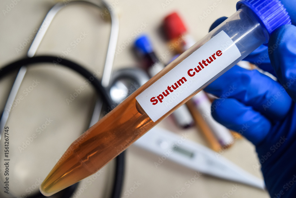 Sputum Culture - Test with blood sample in blue gloved hands. healthcare or Medical concept