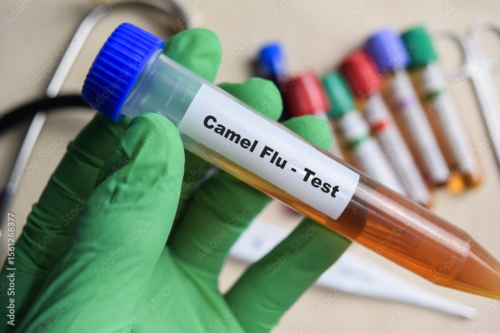 Camel Flu - Test with blood sample in green gloved hands. healthcare or Medical concept
