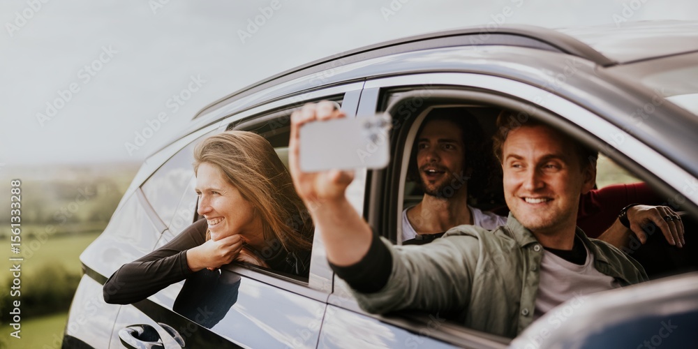 Group of friends enjoying a road trip, smiling and taking selfies. Happy road trip with friends, capturing moments. Scenic drive with friends and fun selfies. Friends taking selfie in car, road trip.