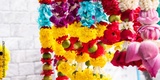 Vibrant flower garlands with yellow, red, and blue blooms. Colorful garlands for festive occasions. Bright flowers and garlands in vivid hues. Colorful garlands with vibrant flowers.