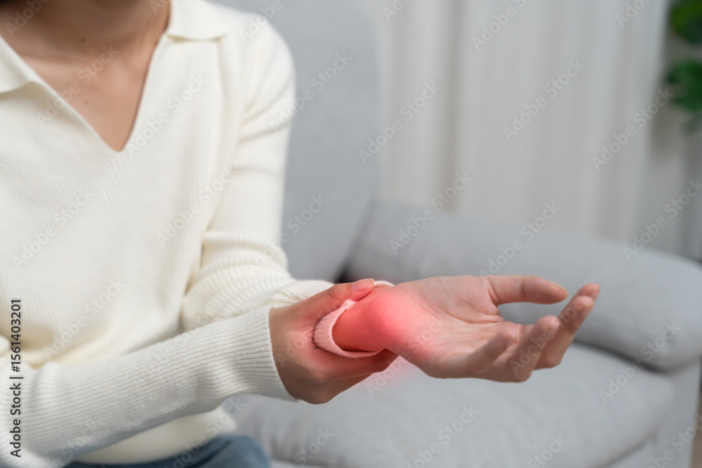 woman working in office with a carpal tunnel syndrome or wrist joint inflammation, hand muscle inflammation from office syndrome , hand muscle pain from working