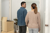 Moving house, relocation. Couple hold hand and open a new house, inside the room was a cardboard box contain personal belongings. move in the new apartment or condominium. smile Couple