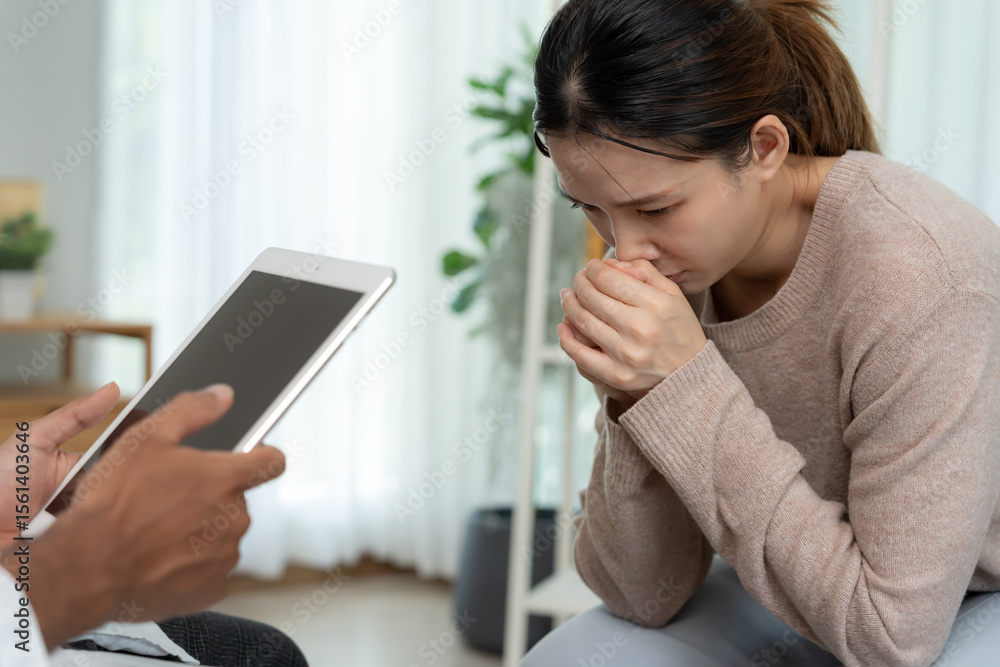 woman with mental health problems is consulting. psychiatrist is recording the patient's condition for treatment. encouragement, love and family problem, bipolar , depression patient, protect suicide