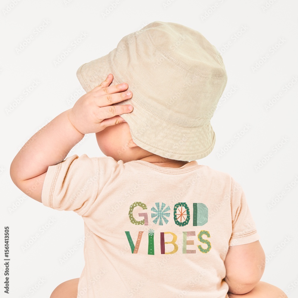 Cute toddler in Good vibe t-shirt, minimal beige design