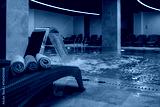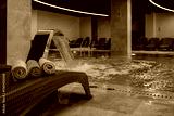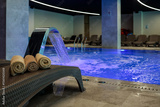 Rolled beige towels on a wicker lounger beside an illuminated indoor pool with a cascading water feature, creating a tranquil spa atmosphere ready for relaxation