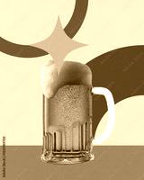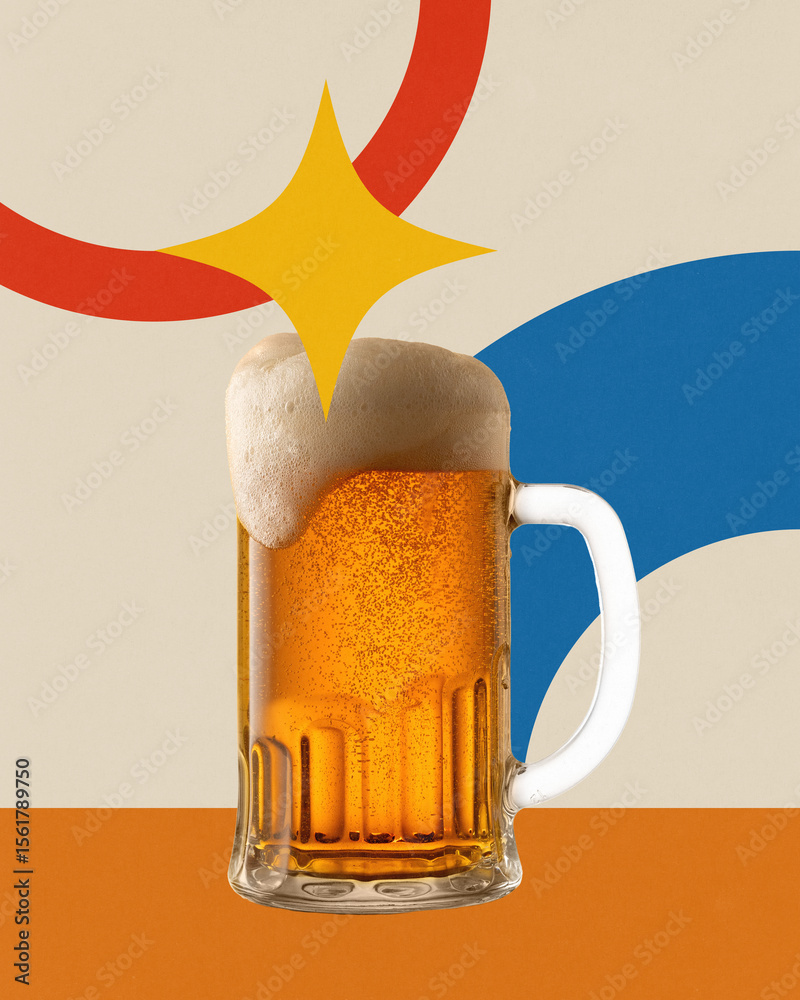 Poster. Contemporary art collage. Green beer bottle with flowing foam, framed by layered abstract patterns in modern colors. Bauhaus graphic elements. Concept of alcohol, party, Friday mood, brewery.
