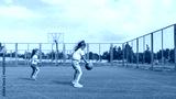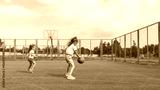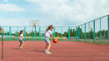 Girl and her younger sister, play basketball on modern basketball court under open sky. Concept of sports, hobbies and healthy lifestyle.