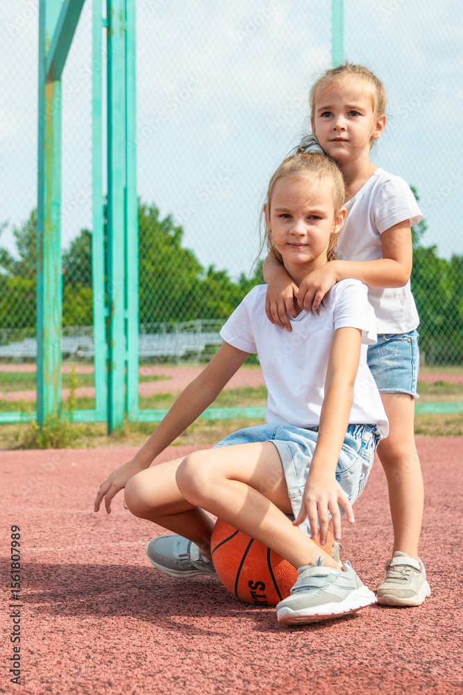 Children are sitting under a basketball basket on the playground with a basketball. Hobbies and active sports games