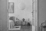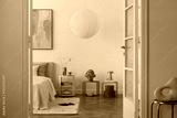 Minimalist bedroom viewed from doorway with art, paper lamp, and decorative accents in soft beige tones. Stylish interior design.