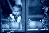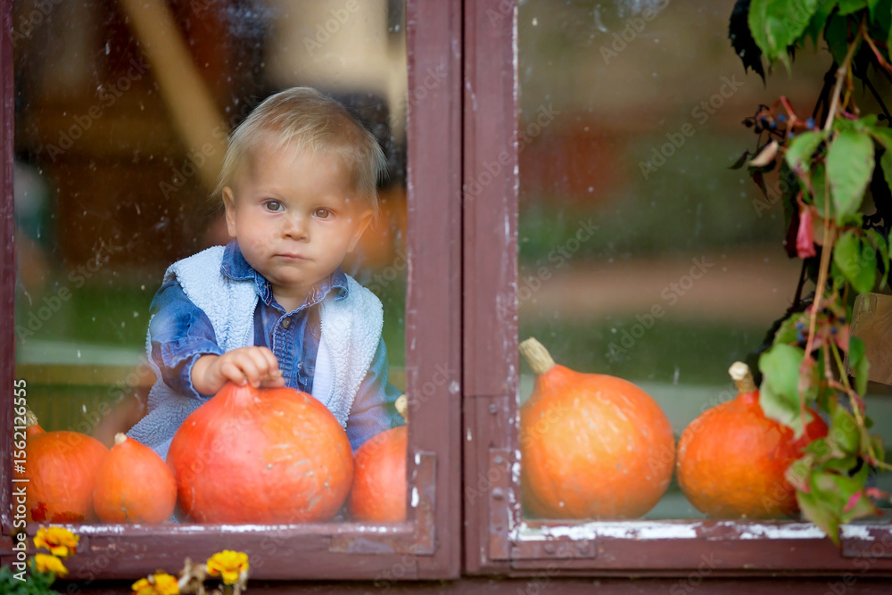 Halloween theme picture of cute cheerful kid looking on the window. Beautiful toddler boy in the house
