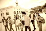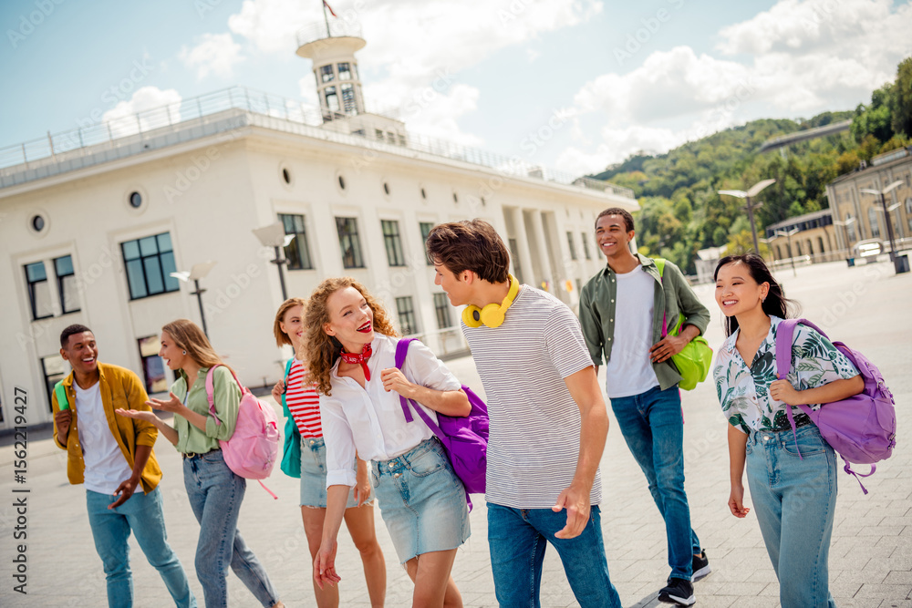 Group of young friends enjoying outdoor school trip bonding in a city center on a bright sunny summer day