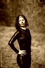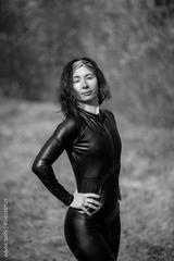 Girl in a field wearing a leather jumpsuit. Catsuit