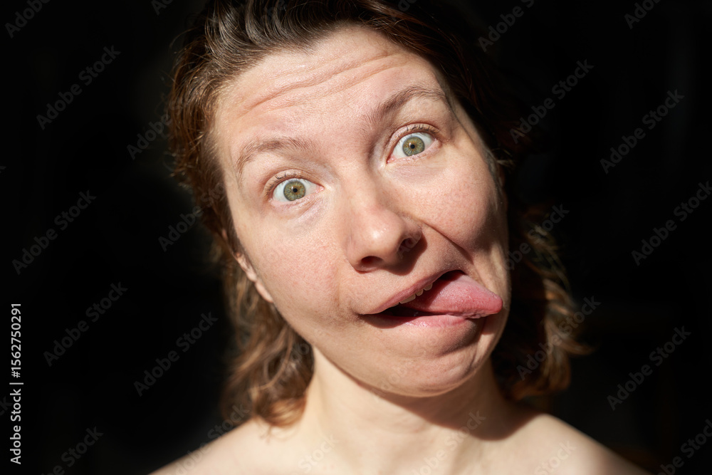 Playful expression of caucasian female adult with quirky face and tongue sticking out in close-up portrait.