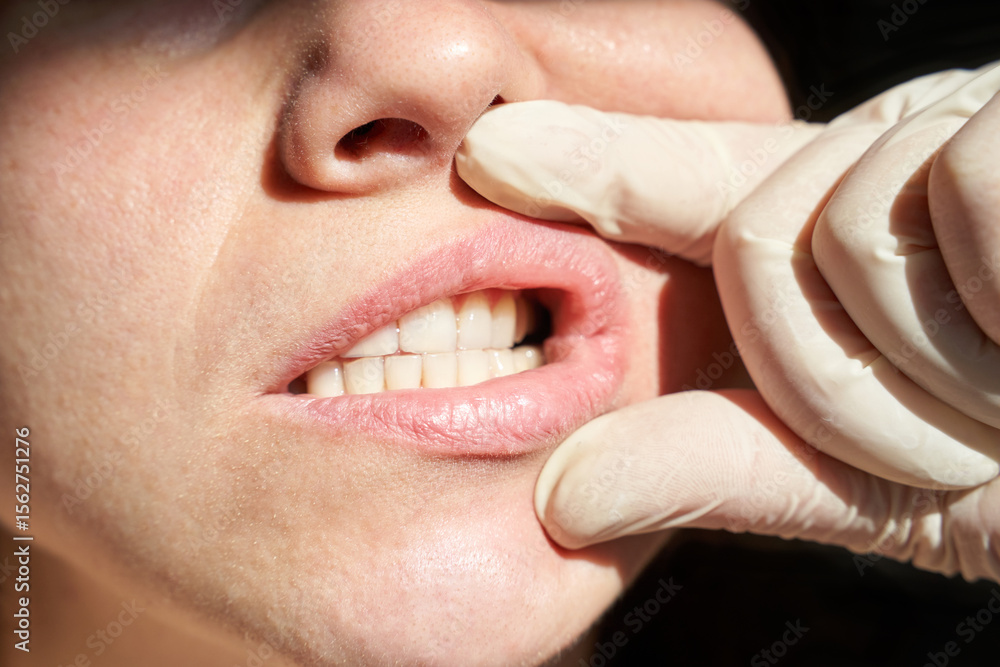 Close-up of caucasian female adult during dental exam with gloves inspecting teeth and lips.