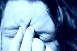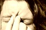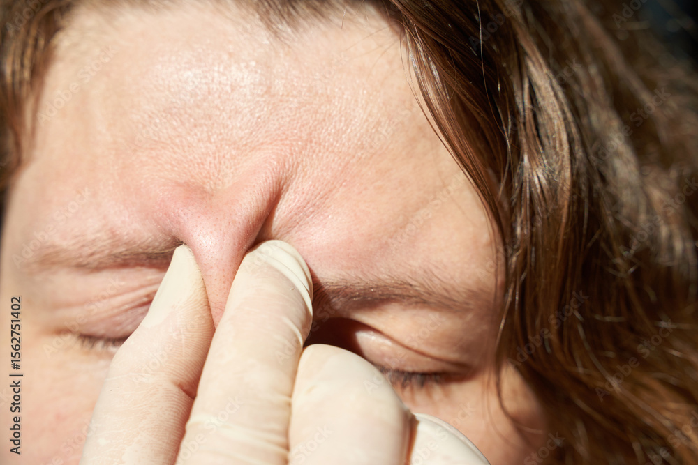 Female caucasian adult suffering from headache pinching forehead in close-up medical examination.