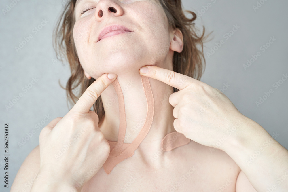 Caucasian adult female using neck taping technique for skin firming and anti-aging in a close-up portrait.