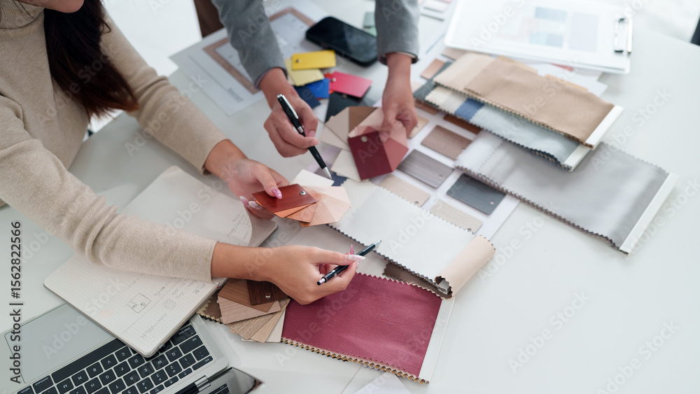 Interior Design Fabric Selection Meeting Featuring Asian Women Choosing Material Samples for Home Renovation Project Consulting with Architect