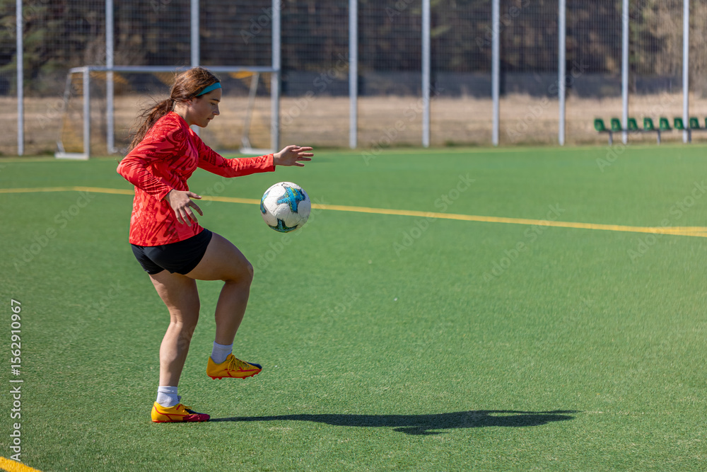 Girl on the soccer field. Soccer training. Active lifestyle. Football concept.