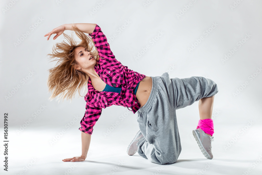 Young beautiful slim girl dancing on a white studio background