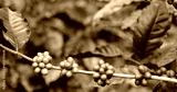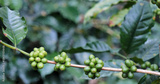 Green coffee bean berry plant with sunlight. Fresh raw seed coffee tree growth in eco organic farm morning time. Close up Green seed berries arabica coffee garden. Fresh coffee bean green leaf plant