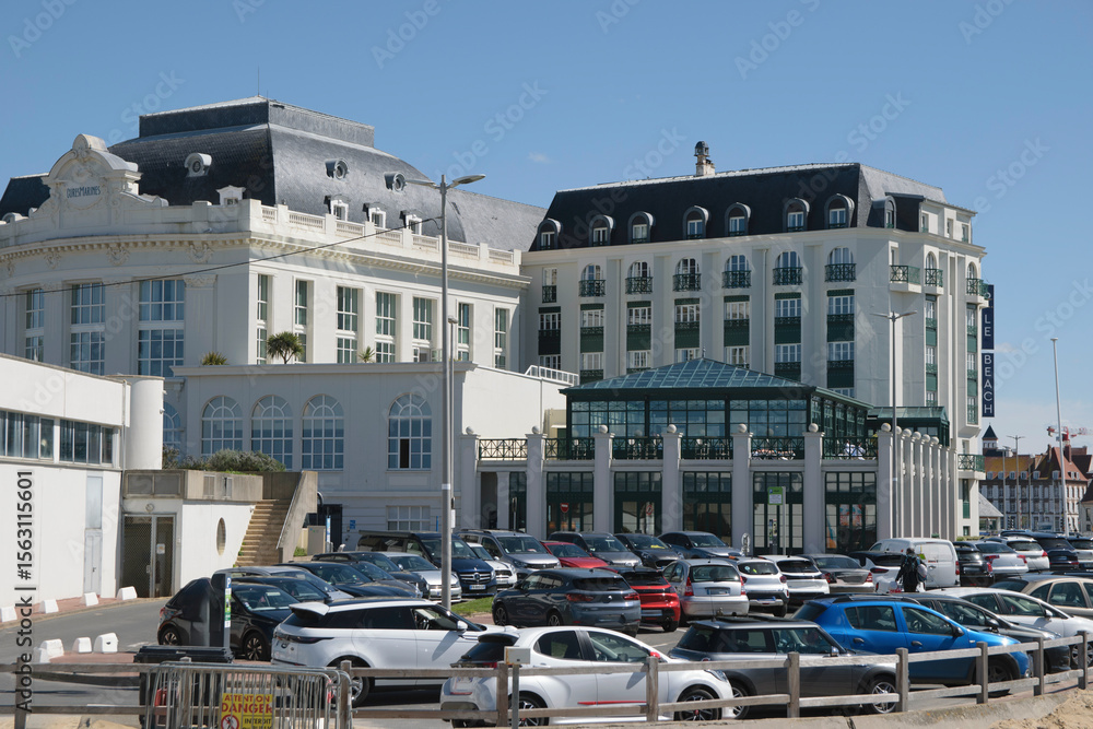 Buildings with a parking lot situated in a coastal town under clear blue skies