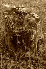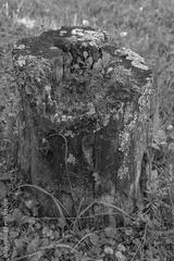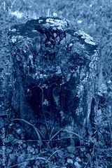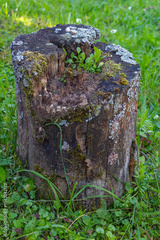 old mossy stump covered with mushrooms in the mysterious twilight of the forest.
