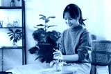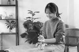 Asian young adult woman engages with tablet for daily artificial intelligence integration at home showcasing smart technology lifestyle