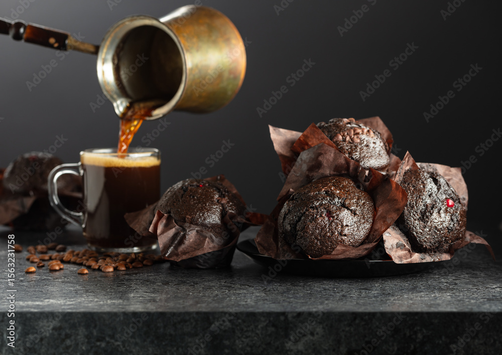 Dark chocolate muffins and cup of black coffee.