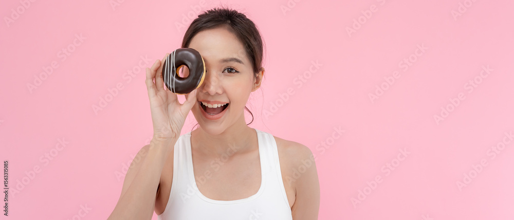 slim body asian women happy will eat donut after diet long time. very bored diet food, dieting female choose low calories food for diet. Good healthy food. weight lose, balance, control, reduce fat