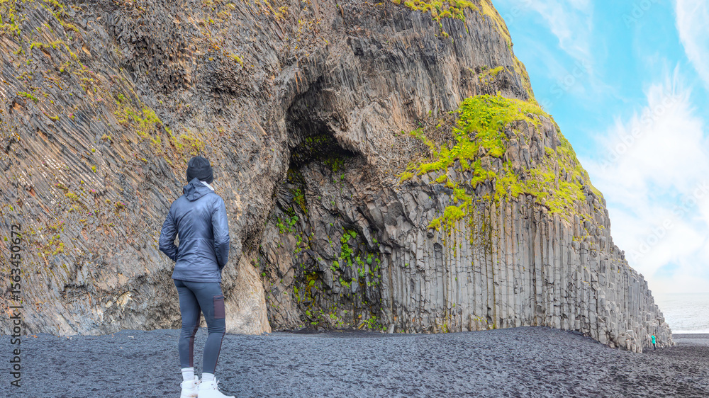 A beautiful woman in a black cap is standing and watching Reynisdrangar rock formations and black beach - Vik, Iceland