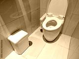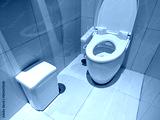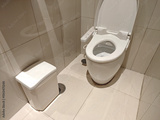 Modern bathroom interior with clean toilet and waste bin