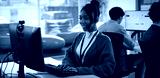 Cheerful customer support representative wearing headset is working at computer in modern office environment. background shows other team members collaborating in bright, open space
