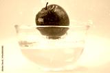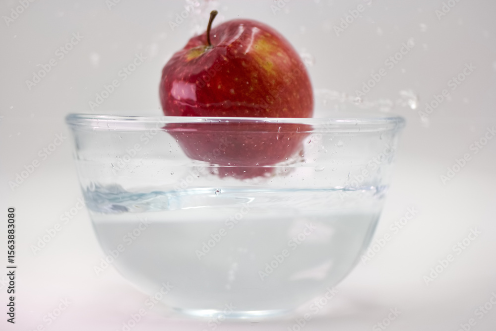Red apple splashes into clear water in a glass bowl creating ripples and droplets in a well lit environment