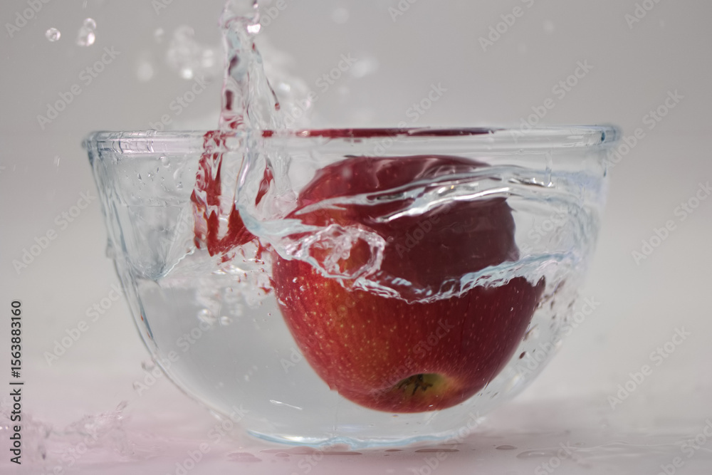Fresh red apple splashing into clear water in a transparent bowl at home kitchen