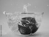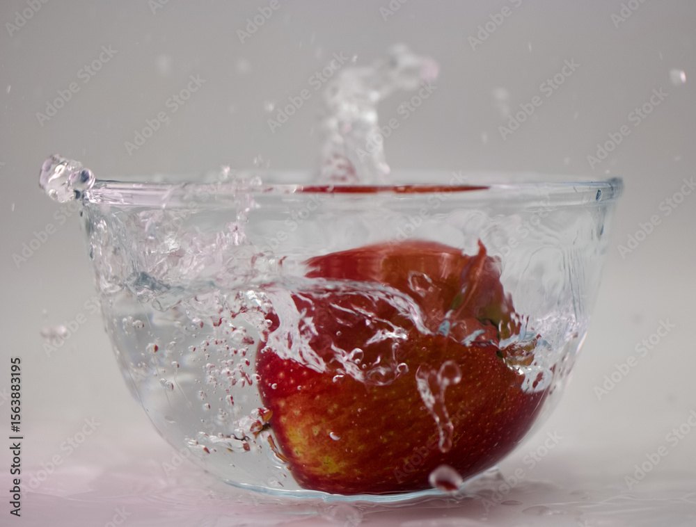 Splash of water surrounds a red apple in glass bowl during a refreshing moment captured indoors