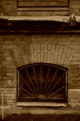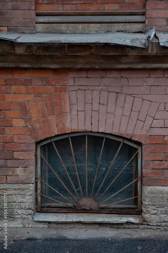 Rusty iron bars cover an arched basement window set in aged brick