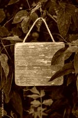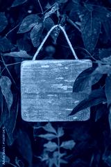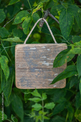 Rustic old wooden empty board hangs on tree