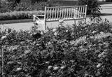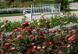 3.07.2025 Białystok Polska. Widok na ławeczkę i piękne kwiaty w miejskim ogrodzie różanym.