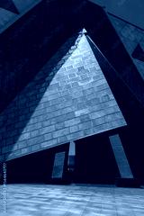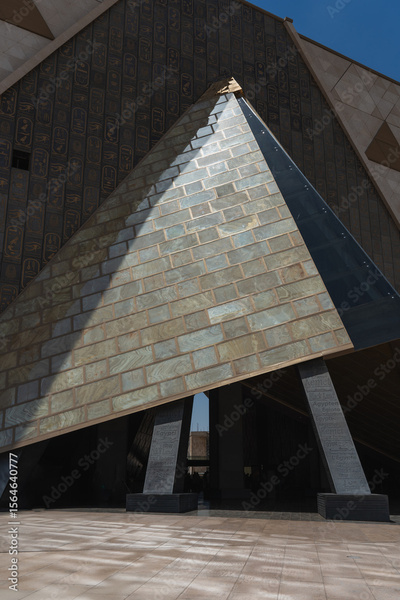 Grand egyptian museum showcasing striking pyramid design and hieroglyphic facade