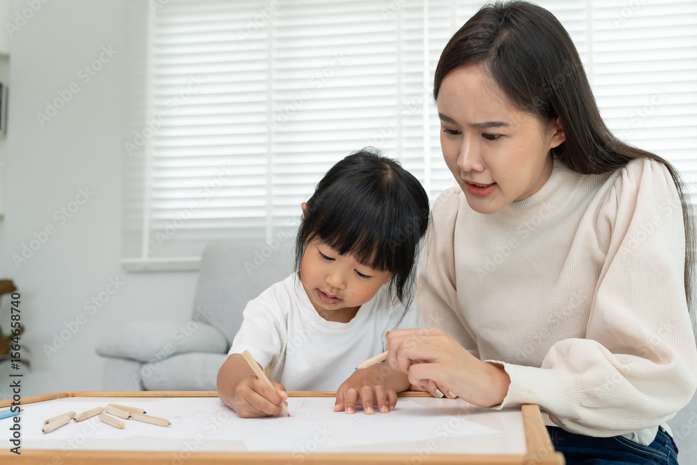 Happy Asia mother playing learning paint for little girl. Funny family is happy and excited in the house. Mother and daughter having fun spending time together. Holiday, Activity